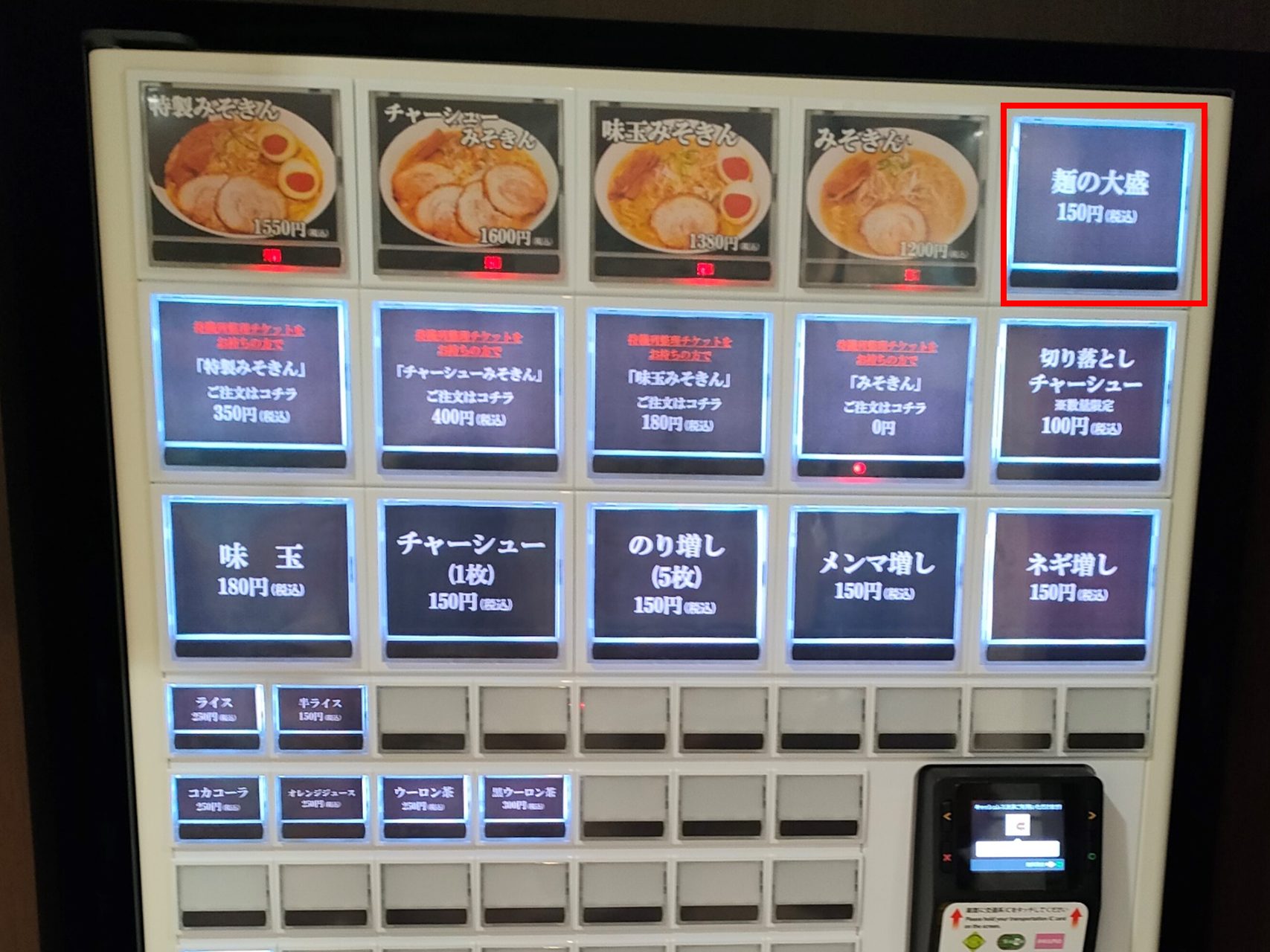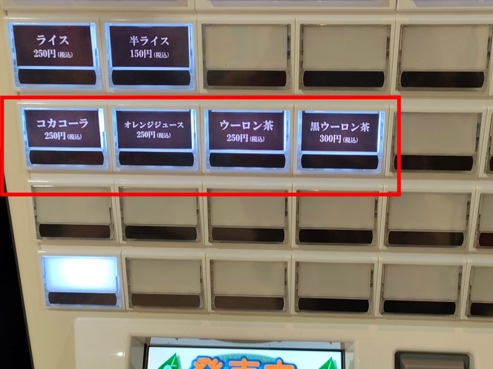 替え玉システムはないので、物足りない方は赤枠で囲った大盛の食券購入を忘れずに!