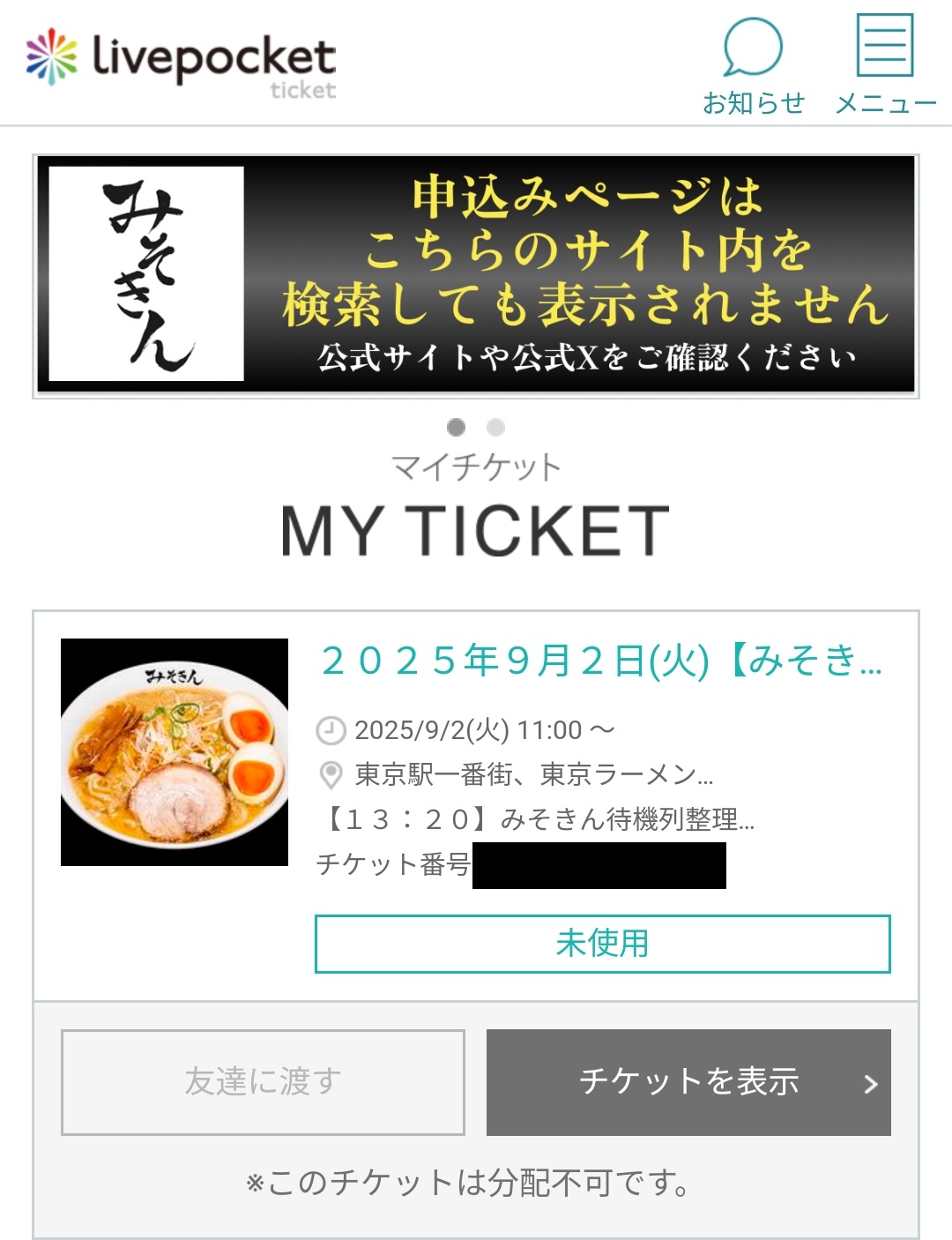 みそきんは完全事前予約制で、公式サイトから「Livepocket」を通じてチケットを購入します。会員登録が必要で、整理券形式のチケットを買うと、その時間帯の「入店待機列に並ぶ権利」が得られる仕組みです。